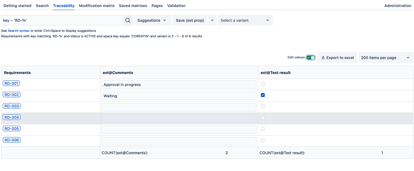 Requirement Yogi allows you to add, edit and track requirement data without disturbing the viewers or the author of the original page. External properties are not visible on the original page but you can see them in the traceability matrix or when you click on the requirement popup. External properties are also exportable to Excel with the traceability matrix.