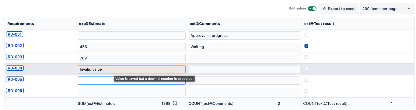Decimal and Integer types allow the creation of aggregations in the traceability matrix: sum, min, max, count, and average.