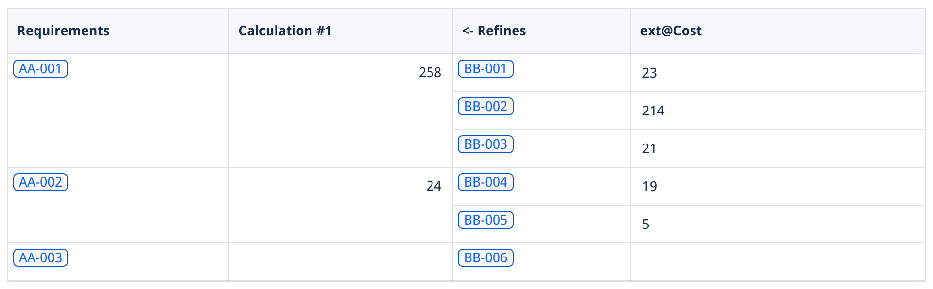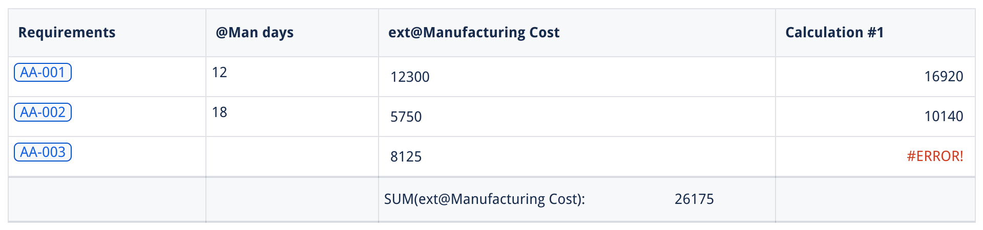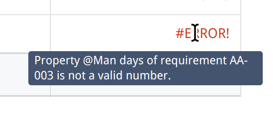 Here, we see that the result for requirement AA-003 is marked as error because the property @Man days used in the calculation is not a valid number.