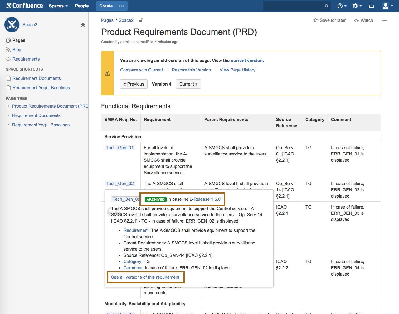 Confluence allows changing the history of pages for space administrators and plugins. Although we won't change the text of requirements, when a user clicks on a requirement to view the page history, Confluence may display the closest version of the page.