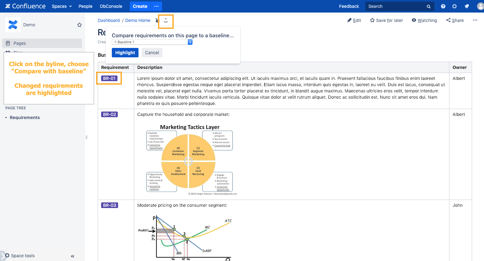 On a page, click the "byline", select "Compare" and choose a baseline to compare to. It will highlight modified requirements. | ![]() |