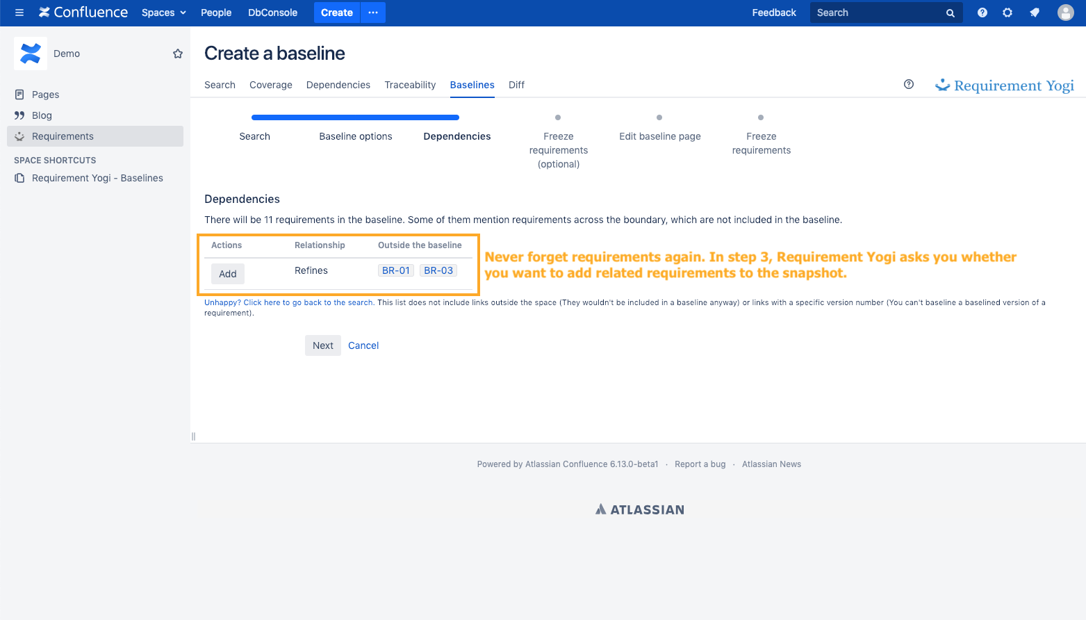 Don't forget to freeze requirementsCreating a page about the baseline is not enough. You must click "Freeze requirements". This allows you to enter details about a baseline before it is entirely ready. ![]() |