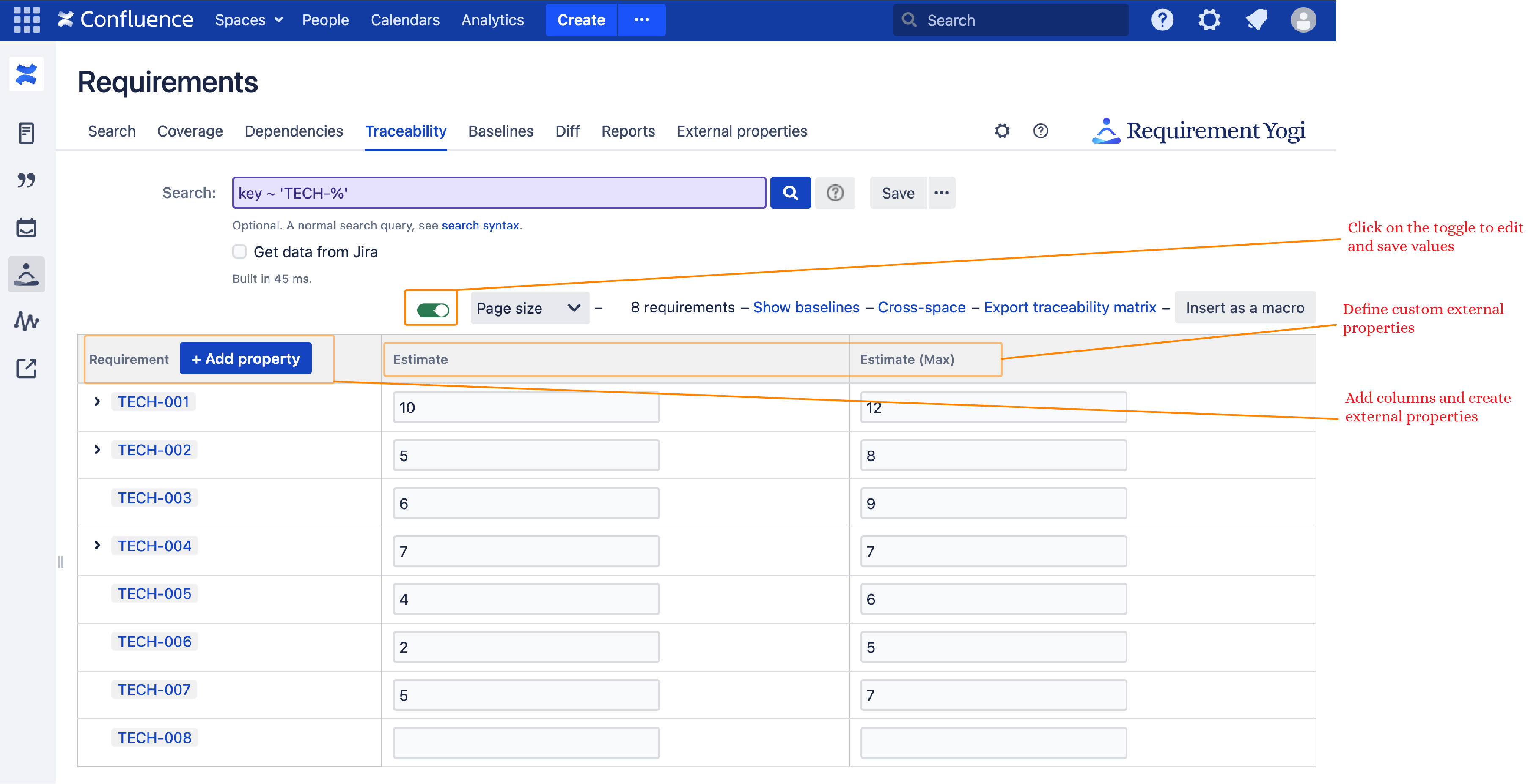 Click on an external property, or on the edit icon, to modify values. This will redirect you to the Traceability Matrix, where you will be able to filter requirements with the search, and edit values using the toggle at the top of the matrix.