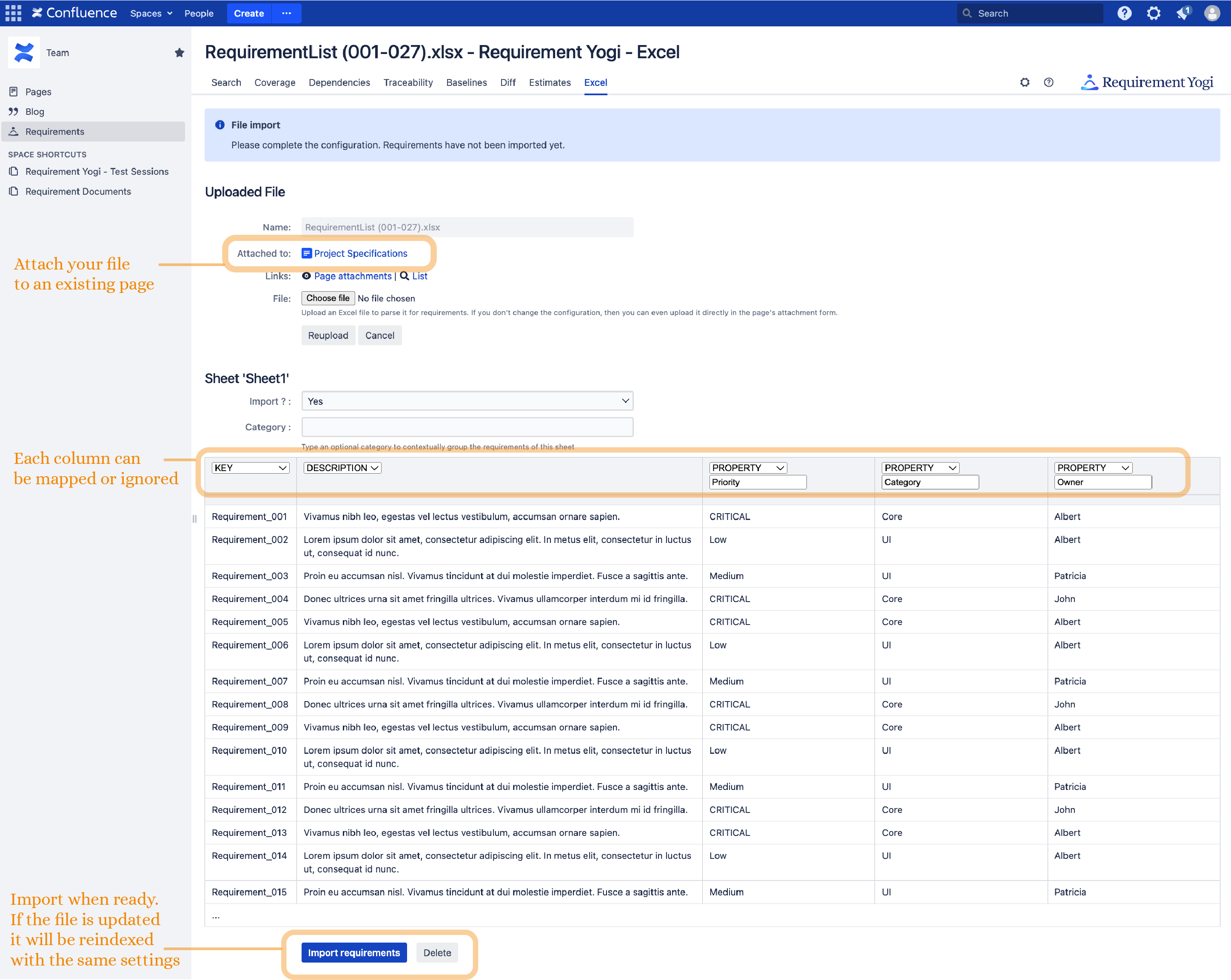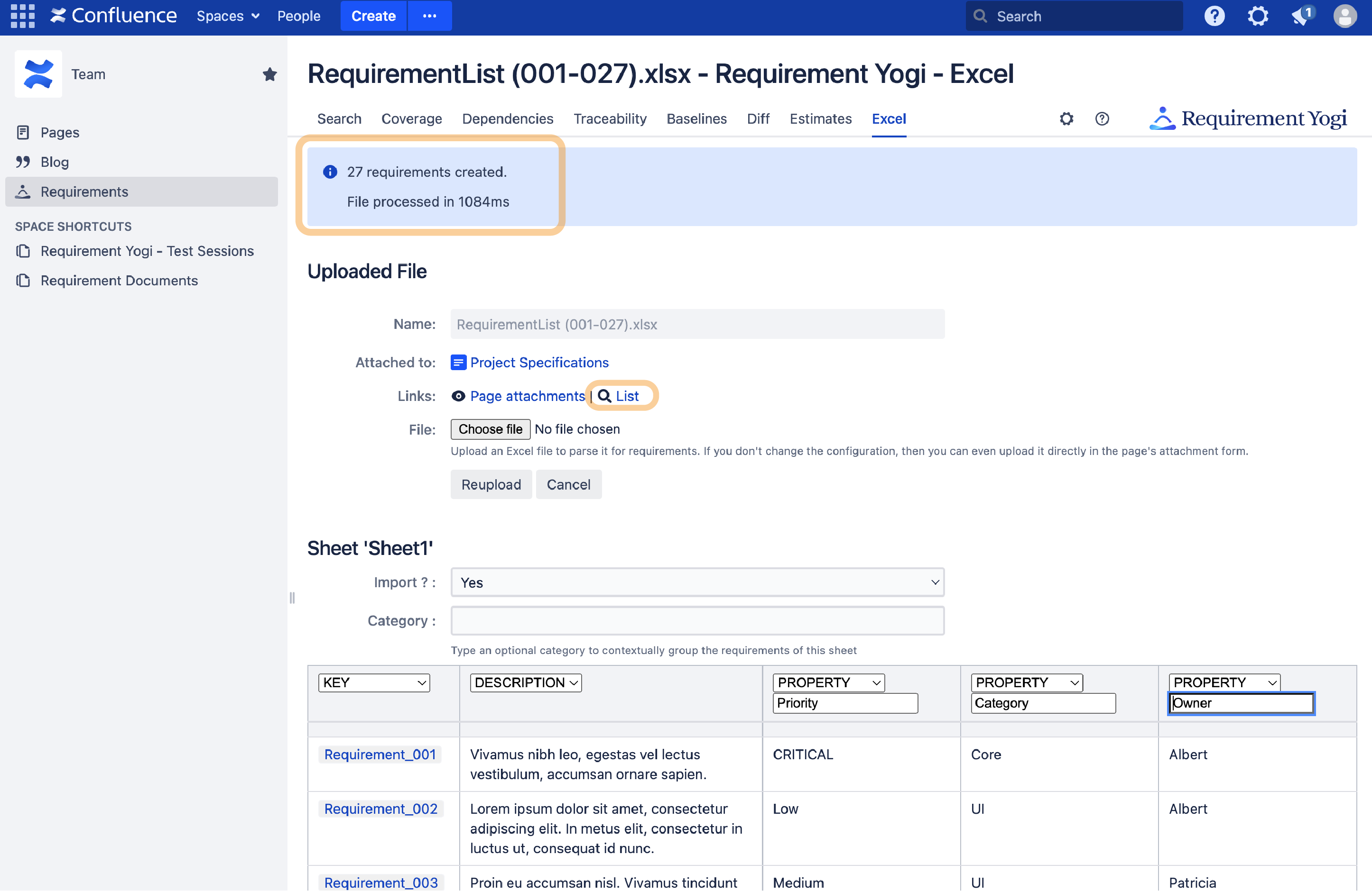 This feature is designed to help you import requirements from other systems. Attach the file to a page, configure the import configuration, click "Import" and they're uploaded.