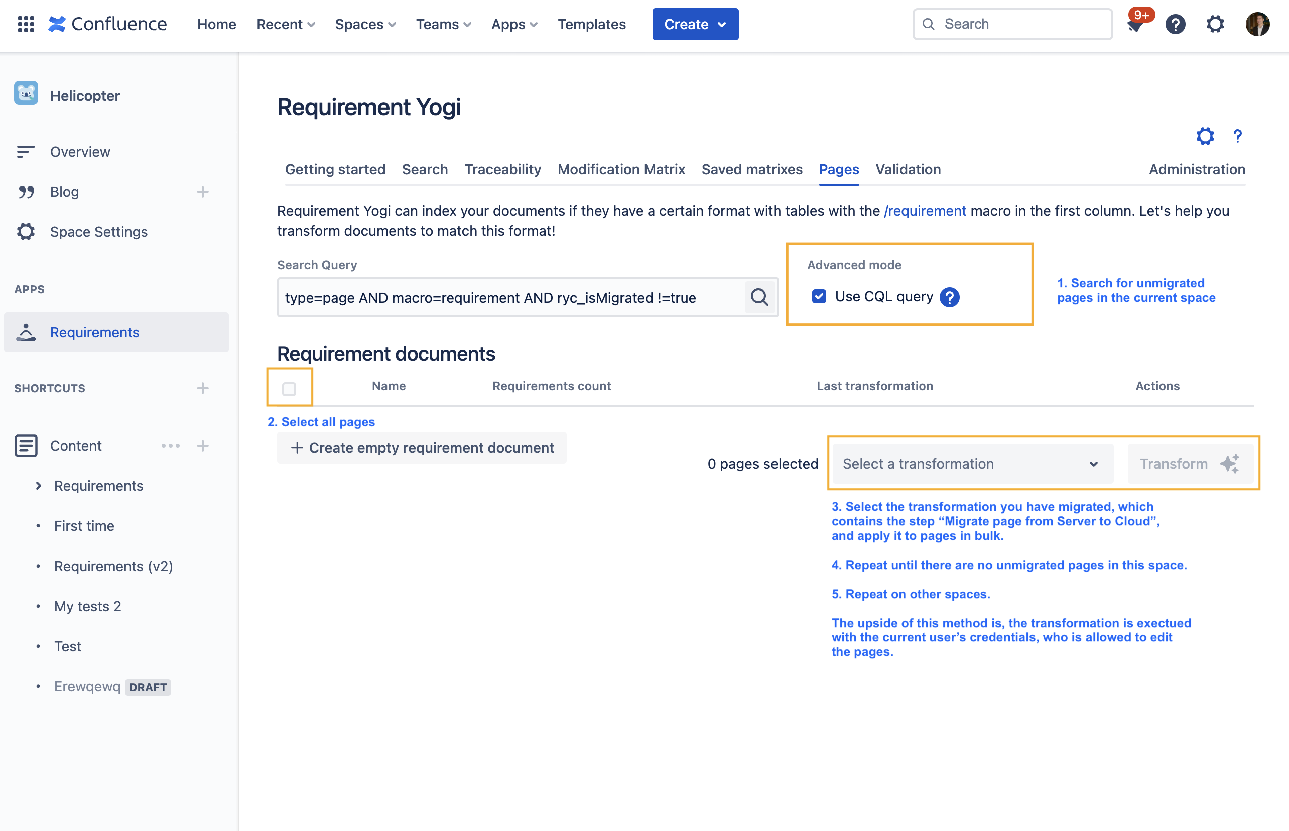 | 1 | Click on the Requirement Yogi Byline (at the top of the page) > Transformation wizard | ![]() |