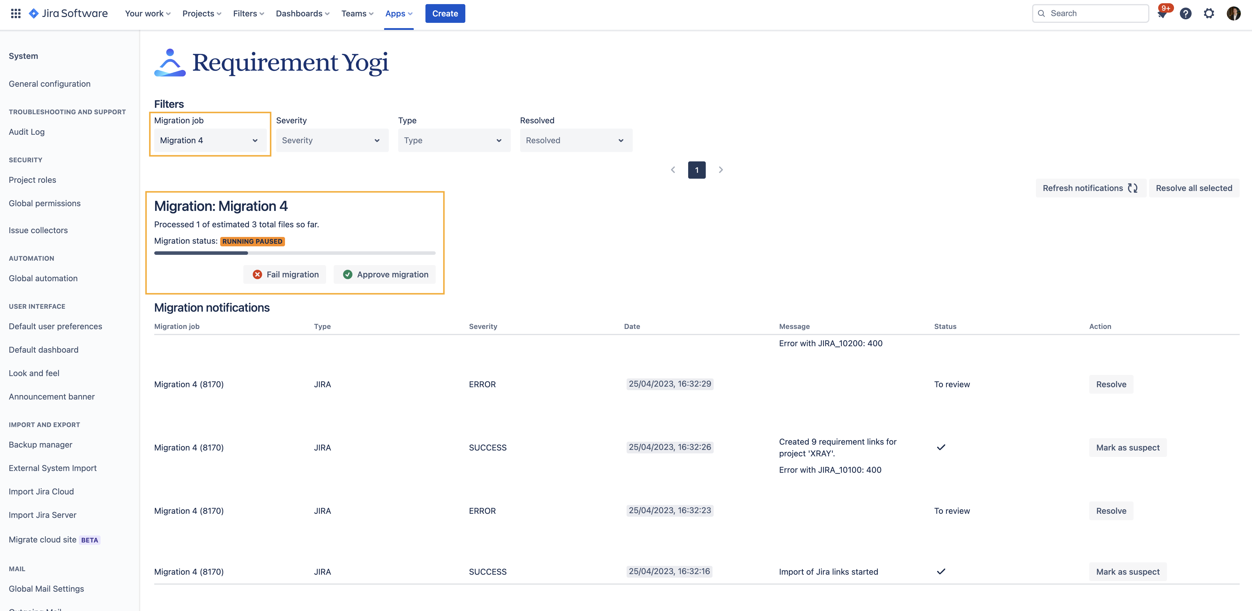 Or in the cloud, in Requirement Yogi configuration > Support > View the migration notifications.