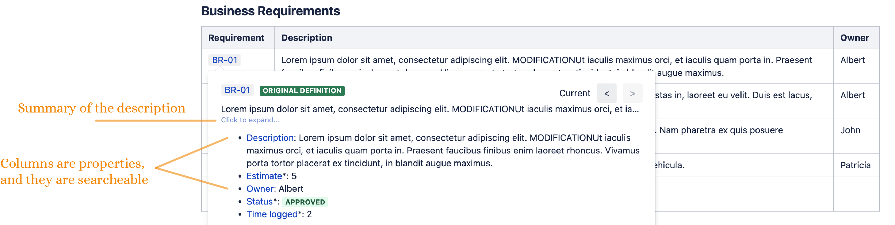 To achieve the configuration of the last section, we've added a small macro in the headers of the table. You can see it on the first screenshot, the name is "RY Properties". Here are the options: