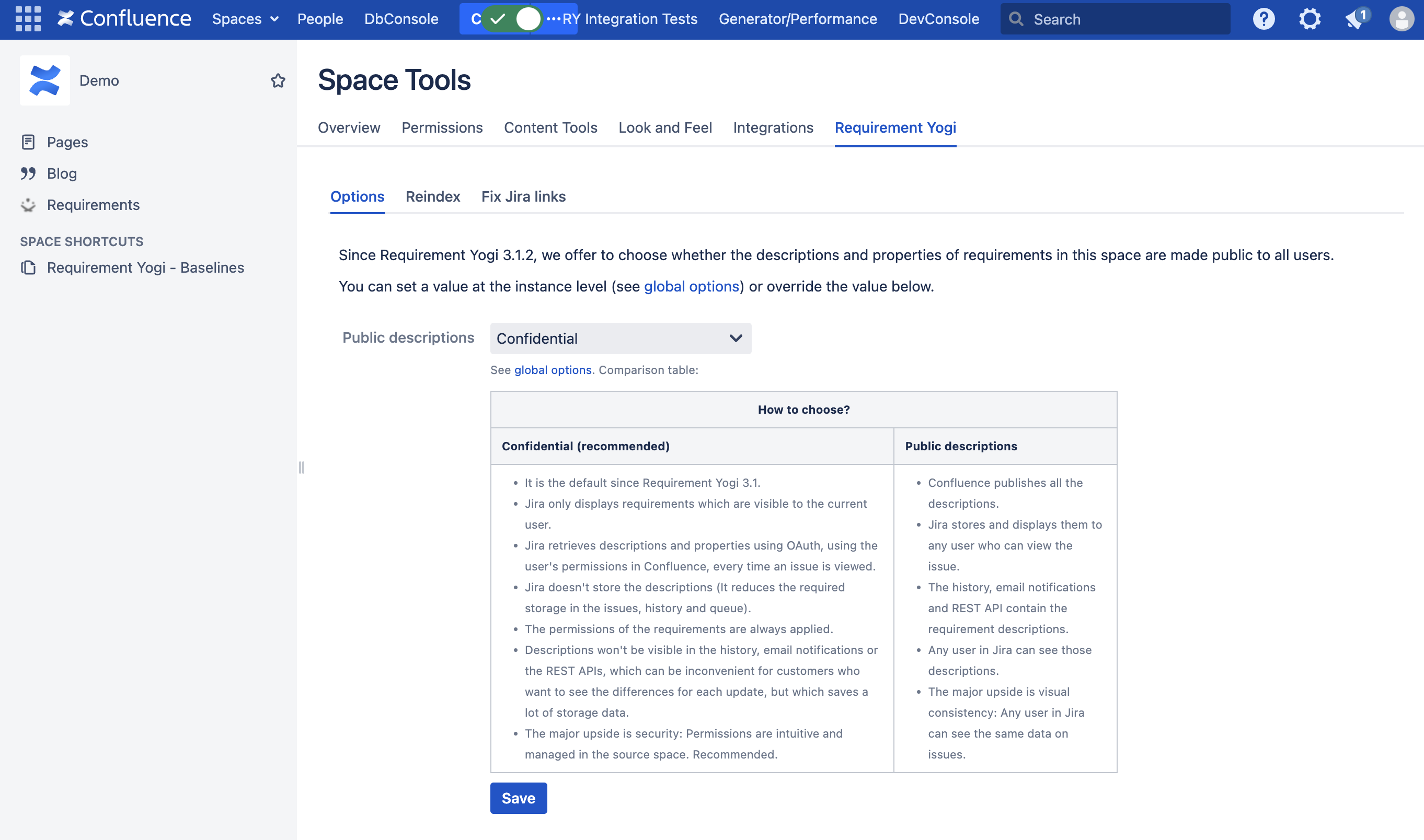 Confluence will automatically default to the second mode, starting in RY 3.2.0. It impacts the notifications and the history in Jira issues (If requirements are non-public, then their body doesn't appear in the history). If you switch this setting later on, then descriptions will only be uploaded in Jira the next time someone uses this requirement on an issue.
