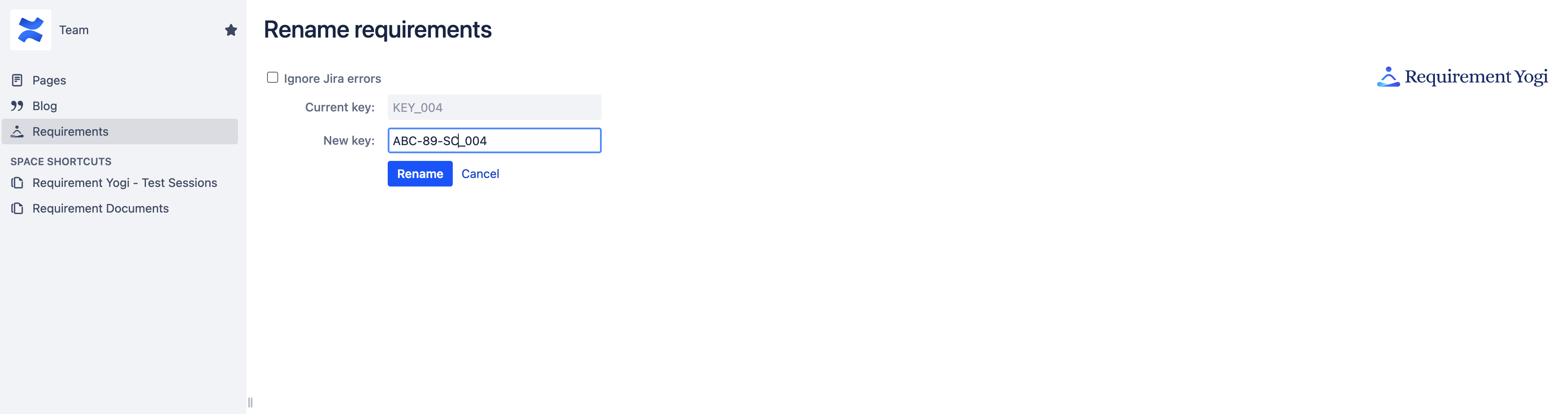 If an error occurs, it will appear at the bottom of the screen. As the status indicates, "No modification was saved", your requirements are safe. This behavior can yet be problematic if the error is thrown from JIRA, as the link between Confluence and JIRA is error-prone. For example, you can have an authentication error. Moreover, if you delete your Application Link, Requirement Yogi keeps a trace of the links in JIRA, just in case you will recreate your Application Link. This is useful, but in case of renaming, it will test the connection with JIRA and fail. This is why we added a check box "Ignore JIRA errors" in the renaming wizard. If you tick it, JIRA errors will be displayed as warning and will not cancel the renaming task (other errors still cancel it). However, if you choose to ignore JIRA errors and an error occurs, your JIRA issues won't be updated. Thus, your requirements links in JIRA will be incorrect, and you will not be able to synchronise them (because they have been renamed, in the JIRA point of view it is no longer the same requirement) and you will have to remove the former links and add the new manually.