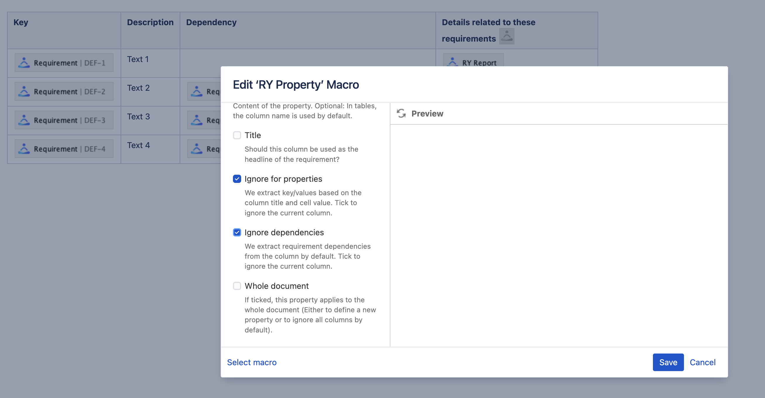 We require that you put an RY Property macro in those columns, to ensure that Requirement Yogi doesn't index the report recursively. See the screenshot: