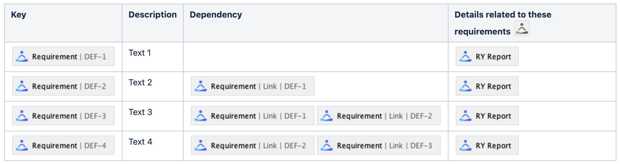 Use the last requirement: It will use the last link or definition. For example, in the screenshot above, the reports will be made respectively on DEF-1, DEF-1, DEF-2 and DEF-3, since they are the last requirements cited.