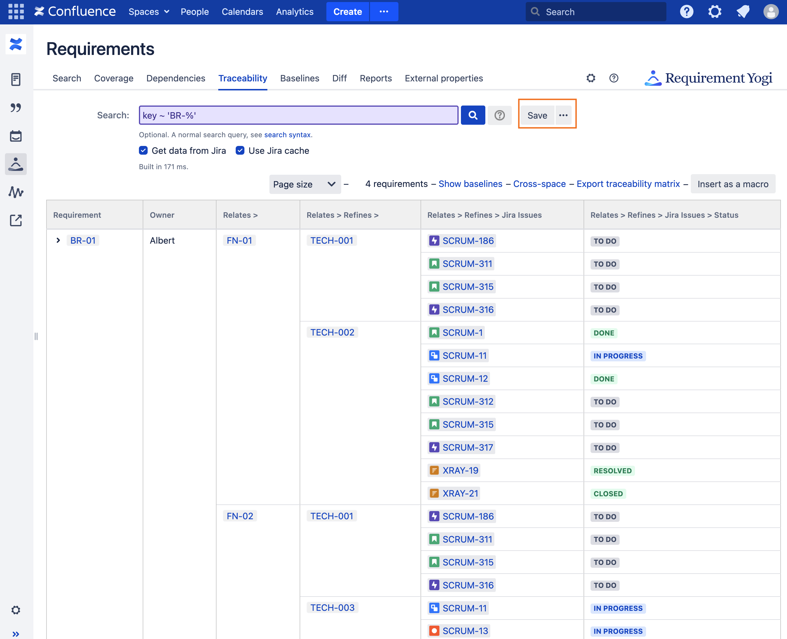 Click on the save button to save your matrix for later, this will also allow you to add it in a Confluence page ( RY Reports ) | ![]() |