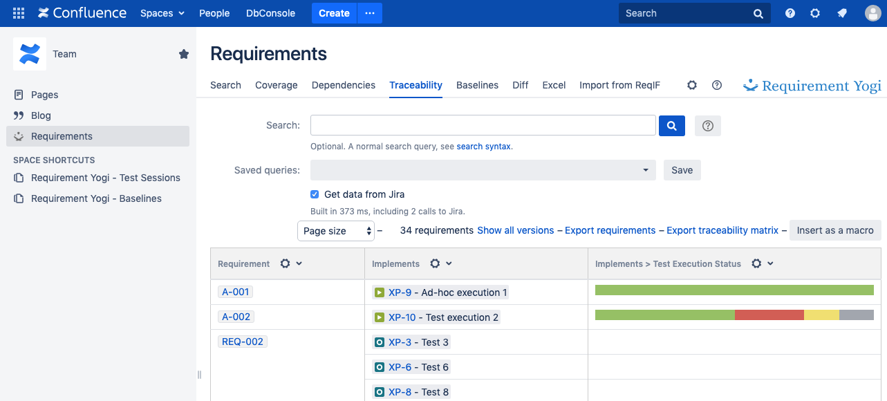 Requirement → Test Execution and their status bars, It is possible to filter by environment, version and to only display the last execution: |